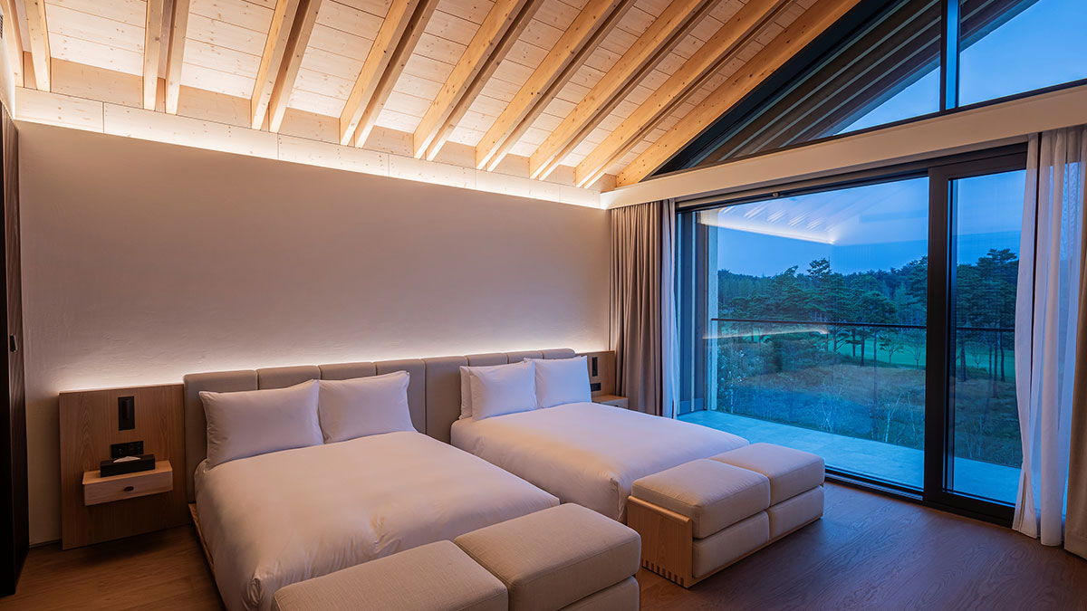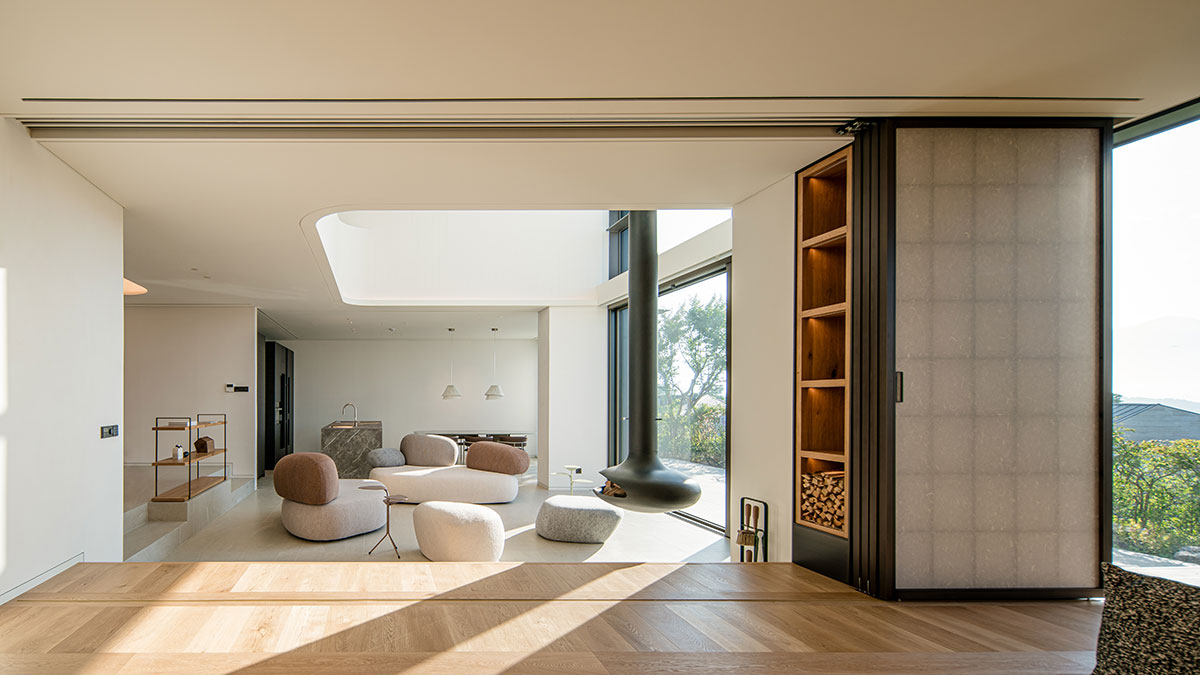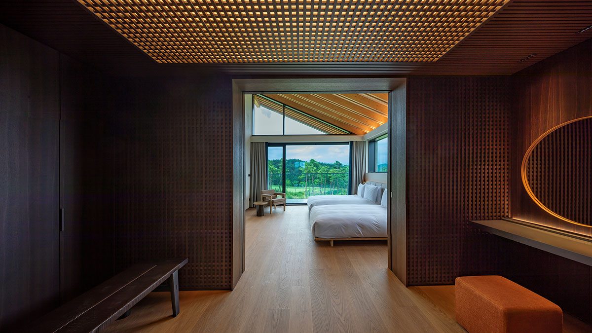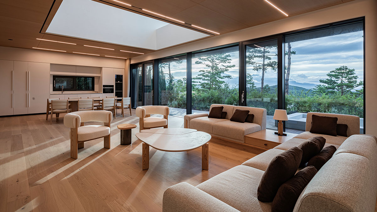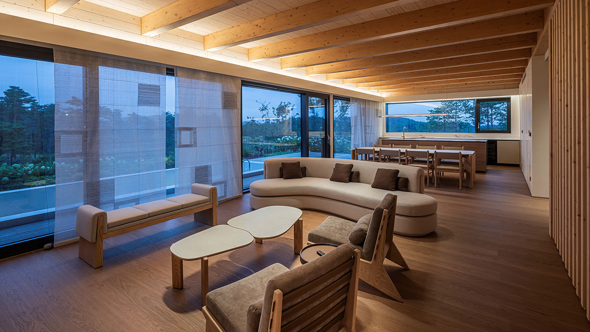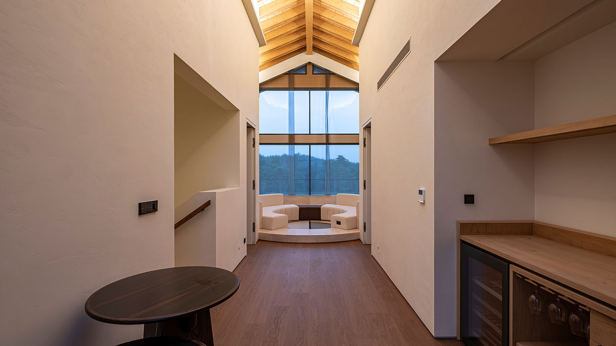 2층 지붕에 설치된 6미터의 긴 천창이 거실까지 연결되어 10미터 높이의 빛이 실내를 비추도록 하여 낮에는 양양의 청정 하늘과 밤에는 쏟아지는 별을 누릴 수 있도록 하였습니다. 설해원의 아이덴티티를 살린 지붕, 서까래를 현대적으로 해석한 외부 또한 주변의 자연환경과 아름답게 조화를 이룹니다.